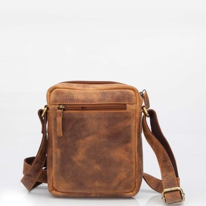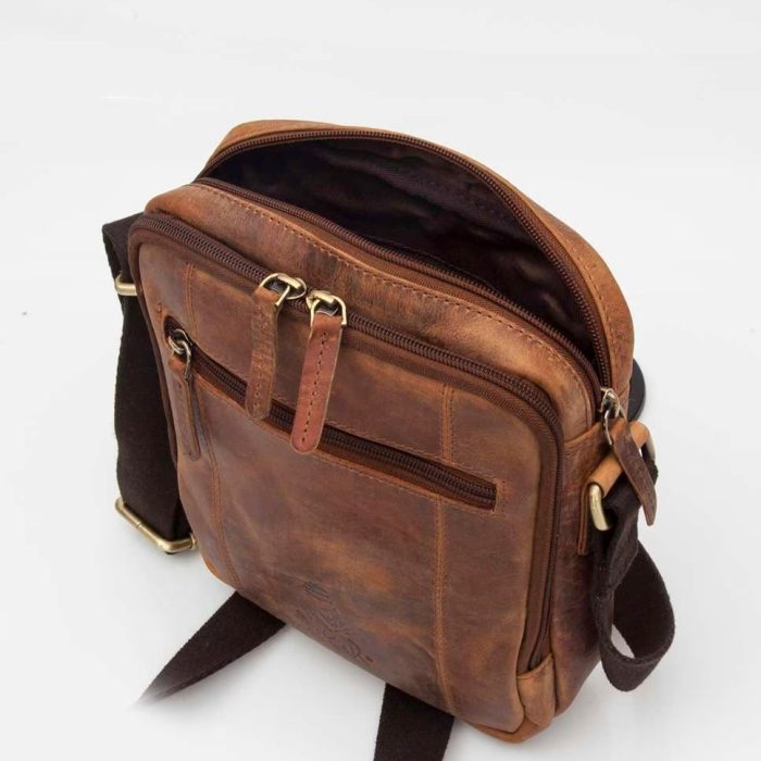 Bandolera de hombre en piel de vacuno Dakar color coñac con logo de la marca grabado en el frontal. Dispone de múltiples bolsillos con cremalleras, bolsillo exterior con cremallera, y bandolera regulable. 100% piel de vacuno efecto vintage de gran calidad.
